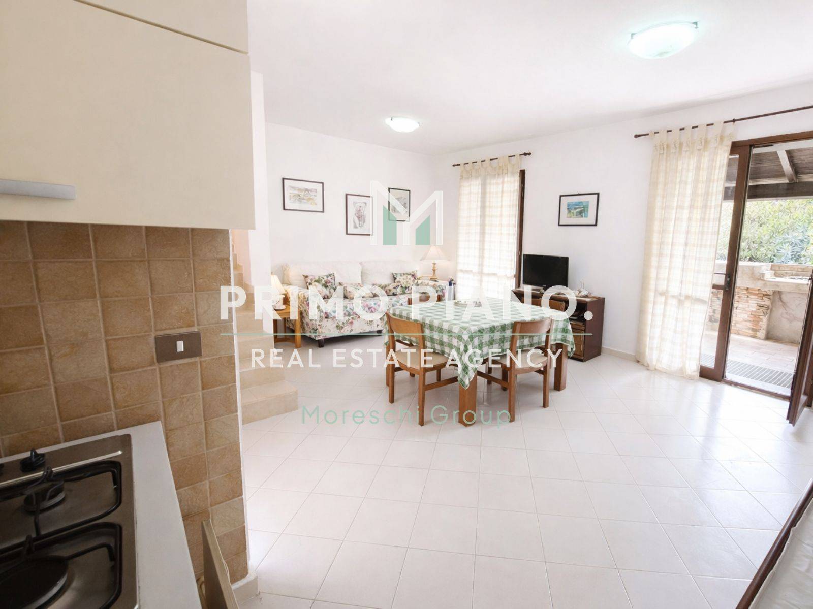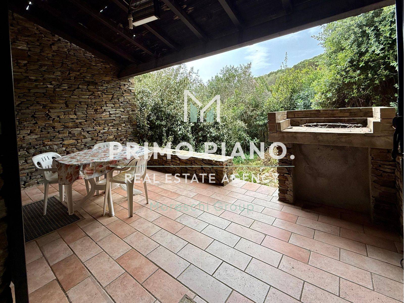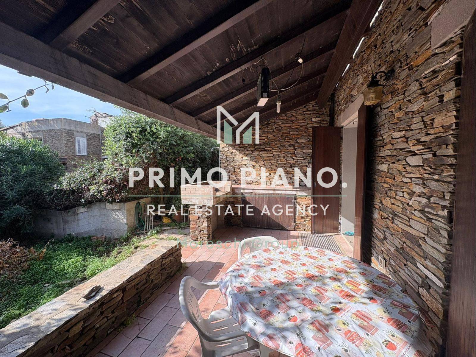 Al piano terra si sviluppa la zona giorno con soggiorno e angolo cottura, entrambi con affaccio diretto su una veranda attrezzata con barbecue e sul giardino, spazi ideali da vivere al meglio durante la bella stagione.