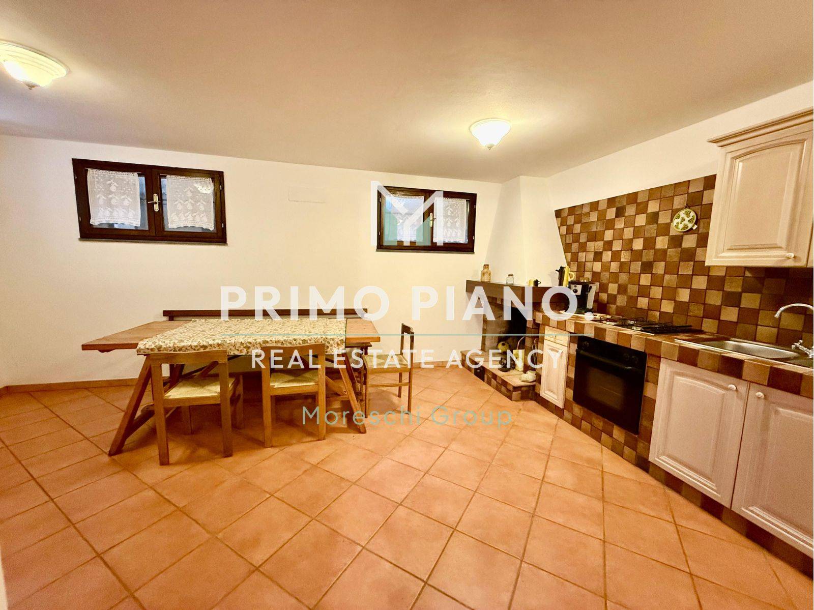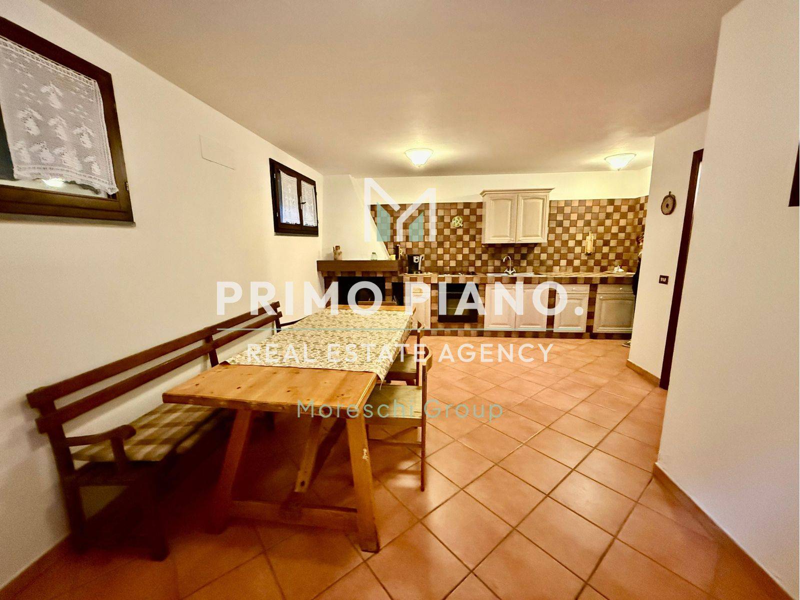 Il piano seminterrato ospita una comoda taverna attrezzata con cucina in muratura e camino, oltre a bagno e ripostiglio, perfetta come ambiente aggiuntivo per accogliere ospiti o creare una piacevole zona relax conviviale.